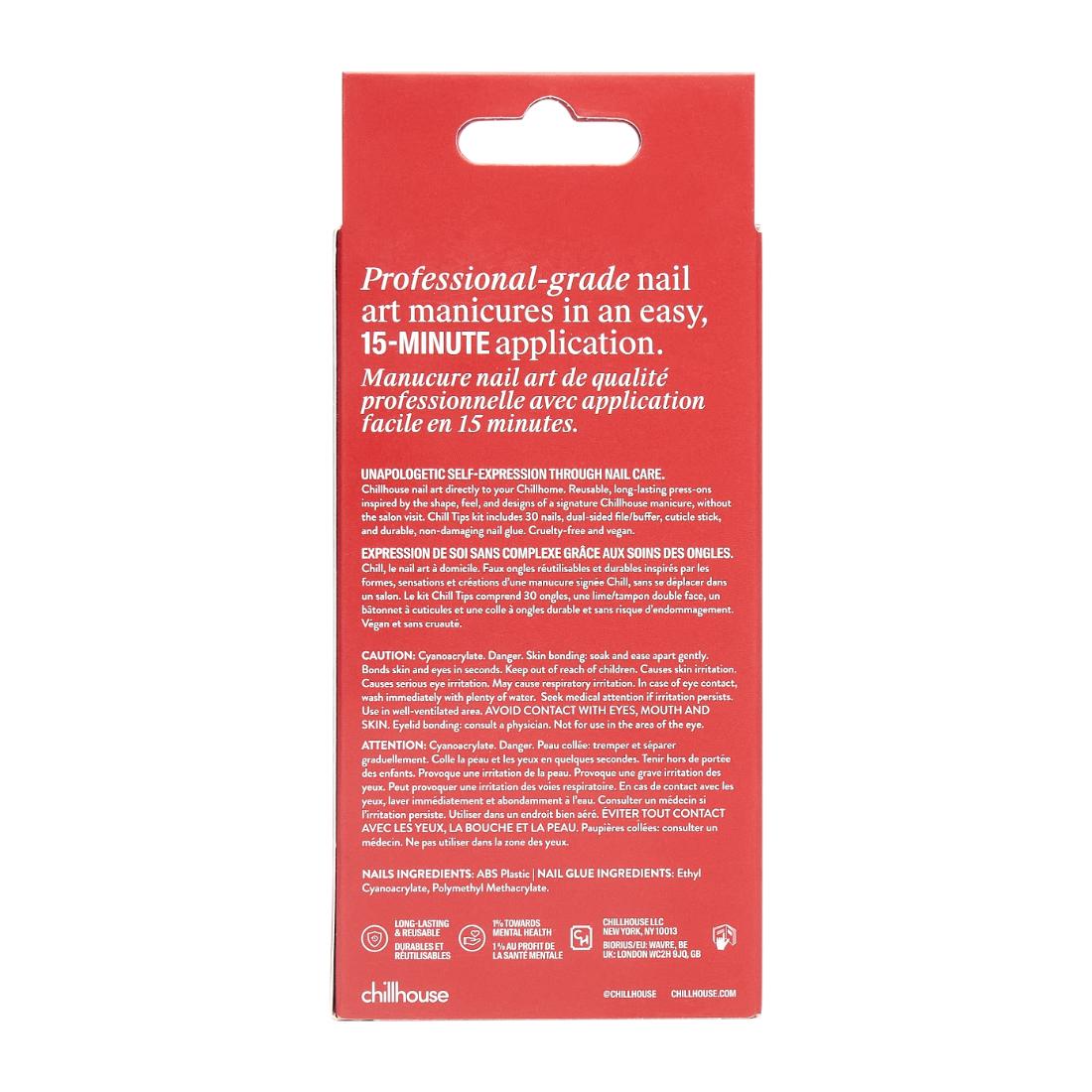 Made with high-quality materials, Chill Tips are comfortable and easy to use from start to finish. The included tools allow you to fully customize the tips to your nail, while the gentle, non-damaging glue secures everything in place for results that have the look and feel of a classic gel mani.