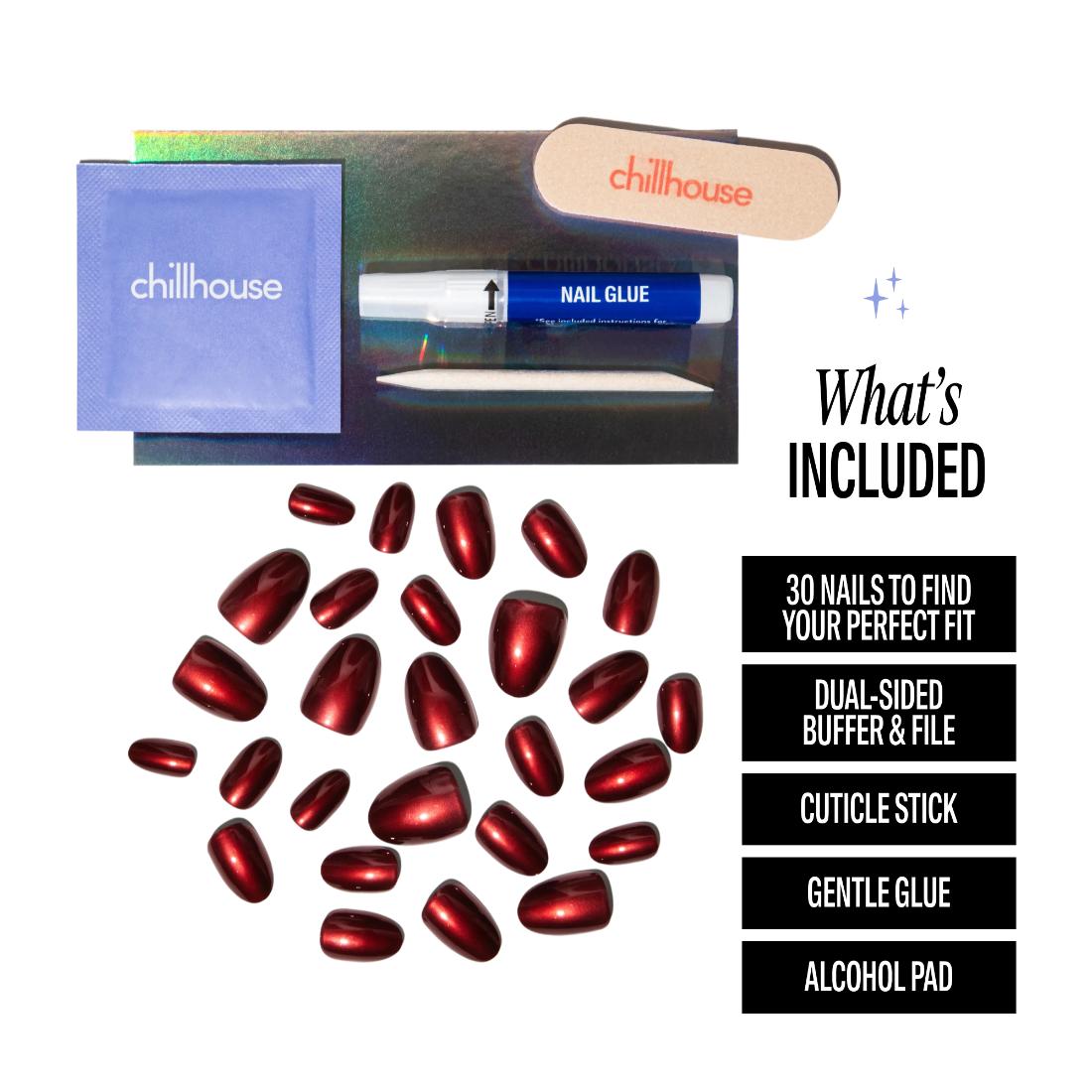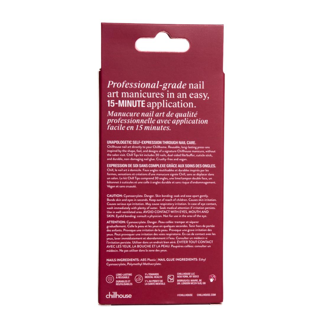 Made with high-quality materials, Chill Tips are comfortable and easy to use from start to finish. The included tools allow you to fully customize the tips to your nail, while the gentle, non-damaging glue secures everything in place for results that have the look and feel of a classic gel mani.