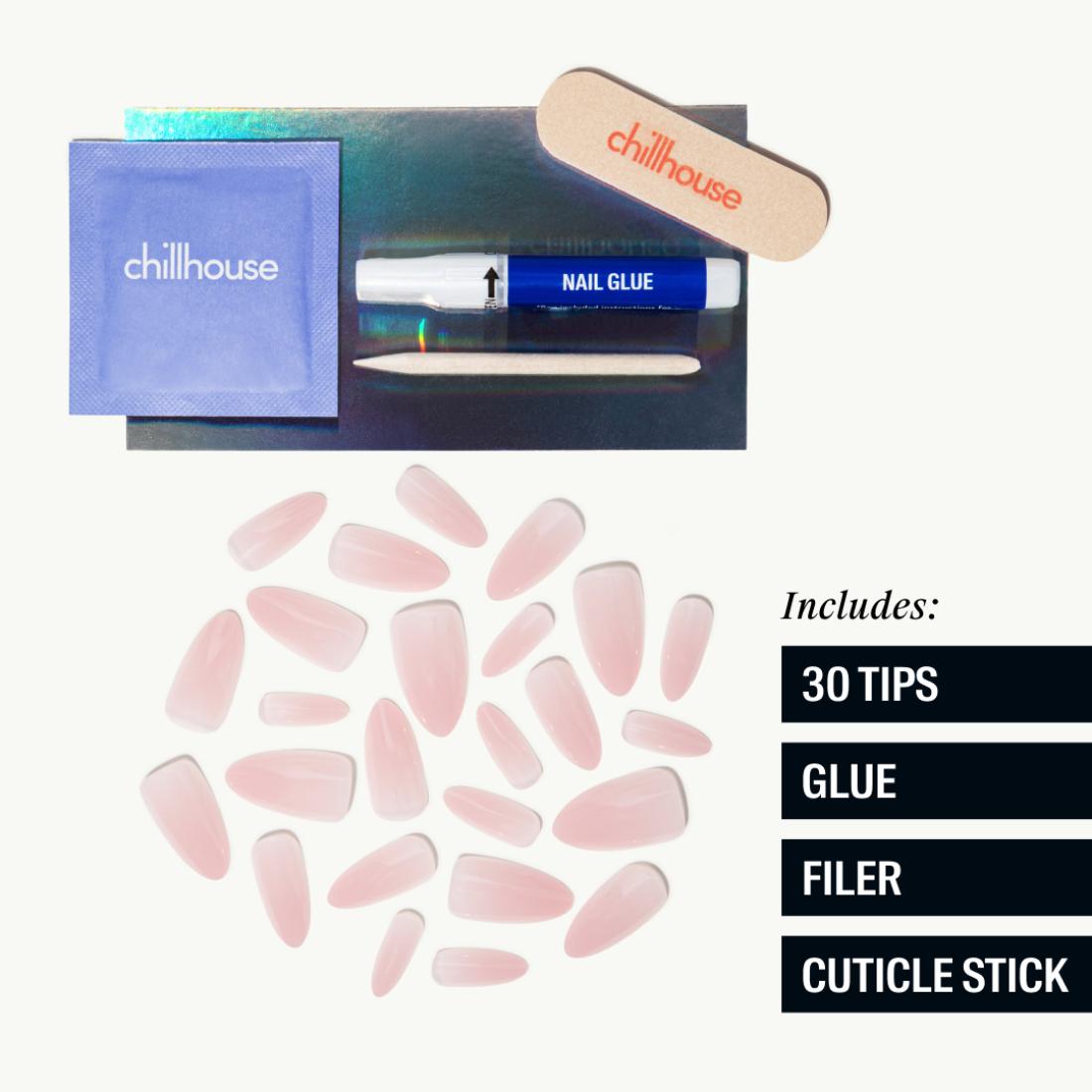 Made with high-quality materials, Chill Tips are comfortable and easy to use from start to finish. The included tools allow you to fully customize the tips to your nail, while the gentle, non-damaging glue secures everything in place for results that have the look and feel of a classic gel mani.