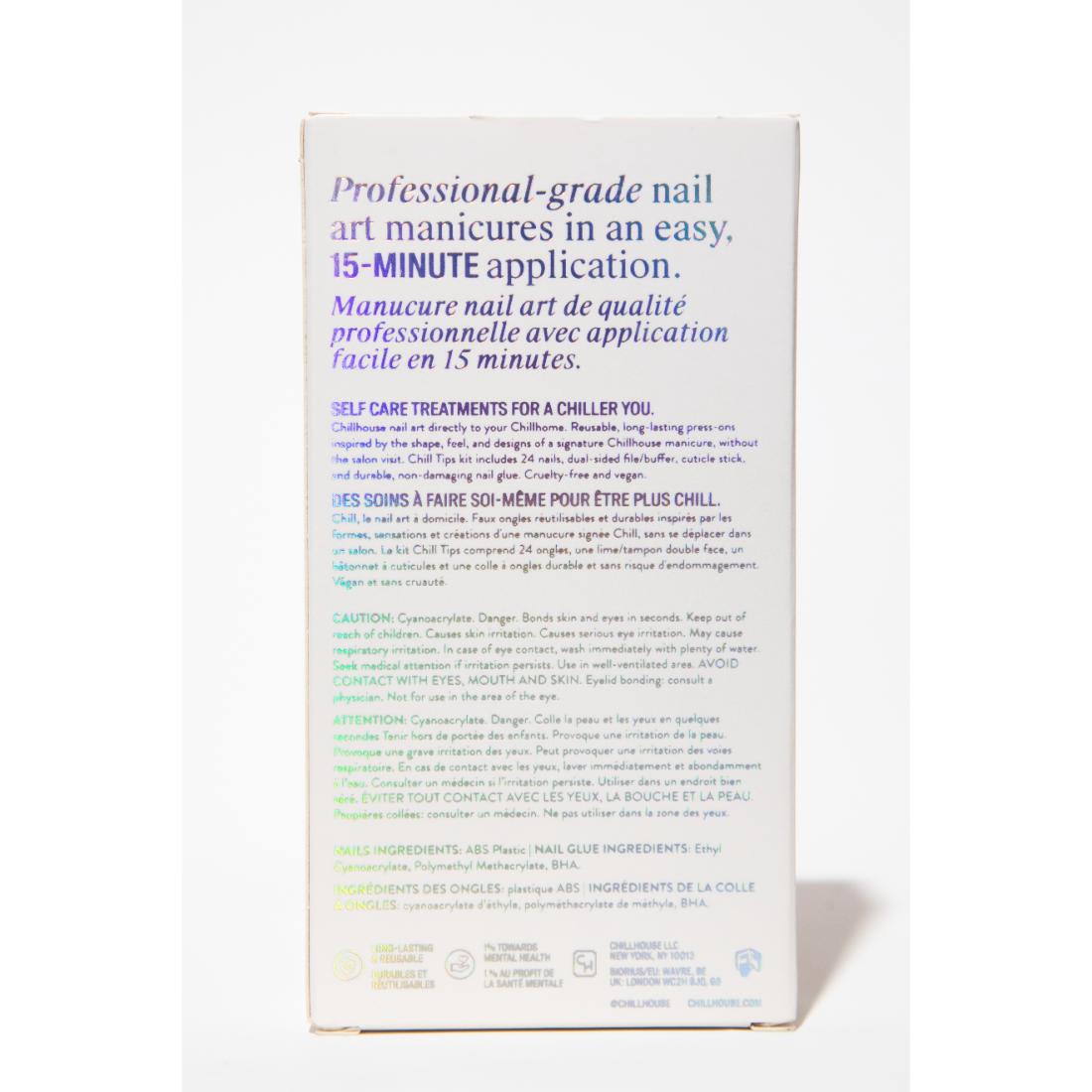 Chill Tips are salon-quality nail art that you can do in your chill home or on the go. There's no mess, no wait time, and no smudges, so you have more me-time.