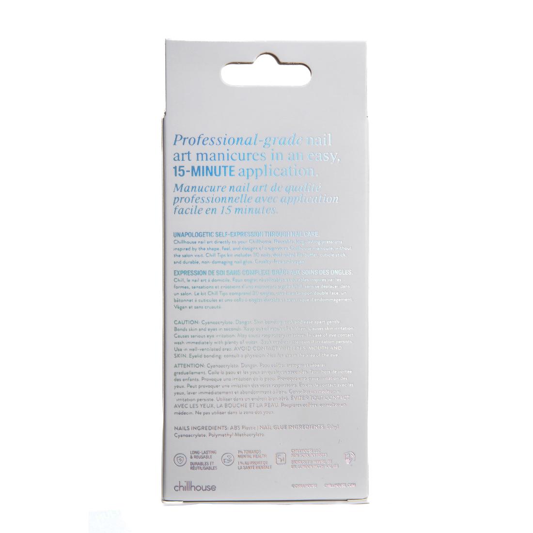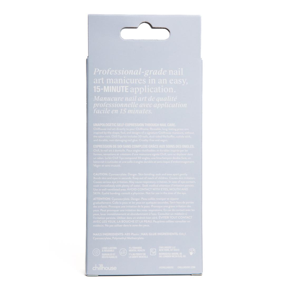 Made with high-quality materials, Chill Tips are comfortable and easy to use from start to finish. The included tools allow you to fully customize the tips to your nail, while the gentle, non-damaging glue secures everything in place for results that have the look and feel of a classic gel mani.
