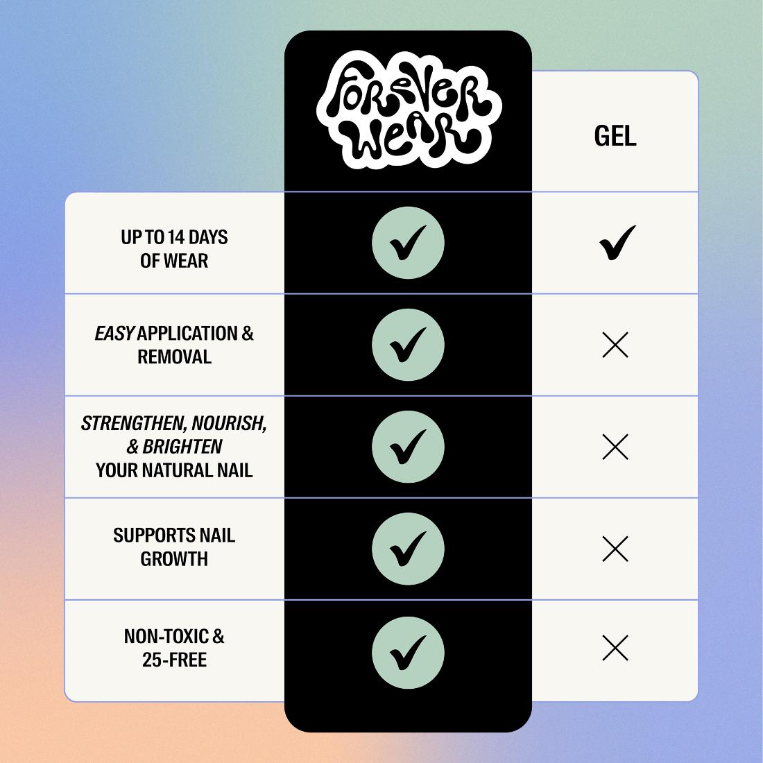 Forever Wear is a two-step, gel-like polish system that strengthens and brightens nails—no UV lamp needed. Pair Chill Paint with Magic Finish Top Coat for a plump, long-lasting mani that resists chips, peels, and scratches.